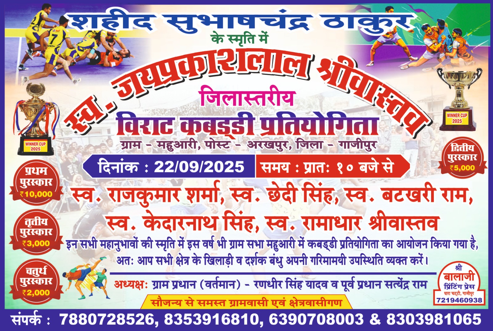 गाजीपुर। अरखपुर महुवारी में 22 सितंबर 2025 को बलिदानी सुभाष चंद्र ठाकुर विराट कबड्डी प्रतियोगिता का आयोजन किया गया। यह प्रतियोगिता स्वर्गीय जयप्रकाश श्रीवास्तव, स्वर्गीय राजकुमार शर्मा, स्वर्गीय केदारनाथ सिंह, स्वर्गीय बटखरी राम, स्वर्गीय छेदी सिंह एवं स्वर्गीय रामाधार श्रीवास्तव की स्मृति में कराई जा रही है।खेल प्रतियोगिता को सफल बनाने के लिए ग्रामवासी और युवा शक्ति महुवारी निरंतर प्रयासरत हैं। इसी क्रम में शिवमंदिर पूर्वी छोर पर बैठक आयोजित कर प्रतियोगिता की रूपरेखा तैयार की गई।बैठक में चंद्रशेखर सिंह, चंचल सिंह, संजय सिंह, बलवंत शर्मा, रामकिशुन यादव, अजीत यादव, विश्वजीत सिंह, शुभम सिंह, मुलायम यादव, गोरख यादव, अमित खरवार, अनुज पाल, रोहित सिंह मसान, नीरज सिंह, हर्ष शर्मा और रजनीश शर्मा समेत कई गणमान्य लोग मौजूद रहे।