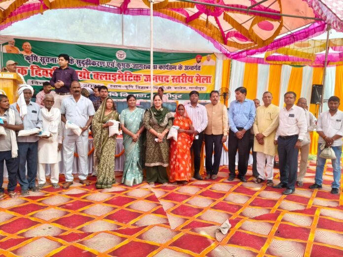 गाजीपुर – कृषि सूचना तंत्र के सुदृढ़ीकरण एवं कृषक जागरूकता कार्यक्रम वर्ष 2025-26 के तहत किसानों को आधुनिक कृषि तकनीकों की जानकारी देने हेतु एक दिवसीय एग्रोक्लाइमेटिक कृषि मेले का आयोजन किया गया। यह मेला विकास खंड सदर स्थित कृषि विज्ञान केंद्र, पी.जी. कॉलेज गाजीपुर परिसर में नगर पालिका अध्यक्ष श्रीमती सरिता अग्रवाल की अध्यक्षता में संपन्न हुआ।मेले में विभिन्न विभागों व प्रतिष्ठानों ने अपने-अपने स्टॉल लगाकर किसानों को कृषि से जुड़ी योजनाओं, उपकरणों व नवाचारों की जानकारी दी। लीड बैंक अधिकारी और डी.डी.एम. नाबार्ड के सहयोग से किसानों को किसान क्रेडिट कार्ड योजना की विस्तृत जानकारी प्रदान की गई।उप कृषि निदेशक ने किसानों से अपील की कि वे पराली न जलाएं, क्योंकि इससे मिट्टी की उर्वरता और मानव स्वास्थ्य पर बुरा प्रभाव पड़ता है। उन्होंने बताया कि पराली जलाने पर शासन द्वारा जुर्माने का प्रावधान है — दो हेक्टेयर से कम पर ₹5,000, दो से पांच हेक्टेयर पर ₹10,000 और पांच हेक्टेयर से अधिक पर ₹30,000 का जुर्माना प्रति घटना लगेगा।प्रधानमंत्री किसान सम्मान निधि योजना के अंतर्गत सभी लाभार्थियों को फार्मर रजिस्ट्री करवाना अनिवार्य बताया गया। फसल बीमा प्रतिनिधि राजीव रंजन ने किसानों को फसल बीमा योजना की जानकारी दी।कार्यक्रम में चना, मटर, मसूर और सरसों बीज के 120 मिनी किट किसानों में वितरित किए गए। कृषि वैज्ञानिक डॉ. शशांक सिंह, डॉ. डी.के. सिंह और डॉ. ओमकार सिंह ने रबी फसलों की नई तकनीकों पर किसानों को प्रशिक्षण दिया।
