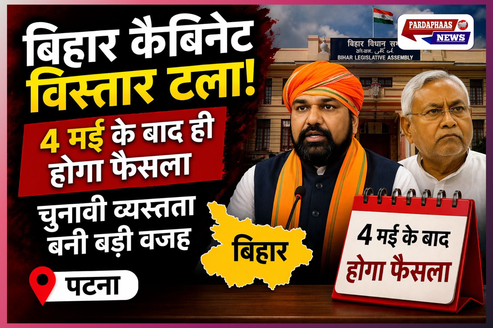 पटना: बिहार में मंत्रिमंडल विस्तार को लेकर इंतजार कर रहे नेताओं को फिलहाल और इंतजार करना होगा। मुख्यमंत्री सम्राट चौधरी के नेतृत्व में प्रस्तावित कैबिनेट विस्तार अब 4 मई के बाद ही होने की संभावना है।