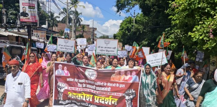 रैली में शामिल महिलाओं और युवाओं ने “राहुल गांधी शर्म करो”, “मां का अपमान नहीं सहेगा हिंदुस्तान”, “कांग्रेस की यही पहचान – मां का अपमान” जैसे नारों के साथ प्रदर्शन किया। हाथों में तख्तियां लेकर लोग बड़ी संख्या में सड़कों पर उतरे।