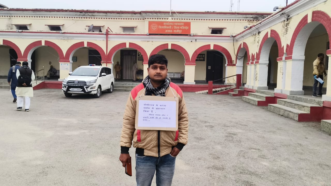 गाजीपुर। करंडा विकास खंड में कथित भ्रष्टाचार और अनियमितताओं के विरोध में एक क्षेत्र पंचायत सदस्य ने शुक्रवार को अनोखा प्रदर्शन किया। भवानीपुर उर्फ तिवारी, वार्ड संख्या–32 से क्षेत्र पंचायत सदस्य गोविन्द कुमार प्रजापति गले में तख्ती बांधकर जिलाधिकारी अविनाश कुमार के कार्यालय पहुंचे। तख्ती पर लिखा था— “योगी राज में करंडा ब्लॉक में भ्रष्टाचार जिंदा है, डीएम साहब मौन? हमारी कभी भी हो सकती है हत्या?”