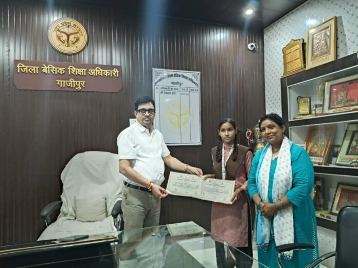 गाजीपुर – विज्ञान एवं प्रौद्योगिकी विभाग, भारत सरकार एवं राष्ट्रीय नव प्रवर्तन प्रतिष्ठान के संयुक्त तत्वावधान में आयोजित इंस्पायर मानक अवार्ड 2024-25 की जनपद स्तरीय प्रदर्शनी एवं प्रोजेक्ट प्रतियोगिता का आयोजन राजकीय बालिका इंटर कॉलेज, मलदहिया, वाराणसी में दिनांक 26 जुलाई 2025 को किया गया था।इस प्रतियोगिता में कम्पोजिट विद्यालय डिलिया, सदर, गाजीपुर की कक्षा 7 की छात्रा कंचन ने अपने प्रोजेक्ट “स्वचालित नाली सफाई प्रणाली” के माध्यम से प्रतिभा का शानदार प्रदर्शन किया। इस प्रोजेक्ट का निर्माण कंचन ने अपनी विज्ञान शिक्षिका डॉ. रितु श्रीवास्तव के मार्गदर्शन में किया था।प्रतियोगिता में कंचन का प्रोजेक्ट राज्य स्तर पर चयनित हुआ, जिससे जनपद का नाम गौरवान्वित हुआ है। इस उपलब्धि के उपलक्ष्य में आज दिनांक 20 अगस्त 2025 को जिला बेसिक शिक्षा अधिकारी, गाजीपुर श्री हेमंत राव द्वारा कंचन को प्रशस्ति पत्र और मेडल प्रदान कर सम्मानित किया गया।बीएसए ने कंचन की सराहना करते हुए कहा कि इस प्रकार की नवोन्मेषी सोच भविष्य के लिए प्रेरणादायक है। उन्होंने कंचन को आगामी राज्य स्तरीय प्रतियोगिता में सफलता प्राप्त करने और उज्ज्वल भविष्य की शुभकामनाएं दीं।यह सम्मान न केवल कंचन के लिए बल्कि जिले के समस्त शिक्षकों और विद्यार्थियों के लिए भी प्रेरणास्रोत है।