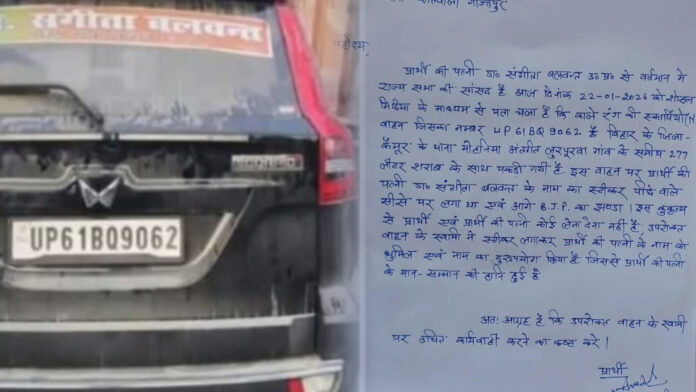तहरीर में सांसद के पति ने लिखा है कि वाहन स्वामी द्वारा जानबूझकर सांसद के नाम का स्टीकर लगाकर उनके नाम और मान-सम्मान को धूमिल किया गया है। इससे उनकी पत्नी की सार्वजनिक छवि को नुकसान पहुंचा है।