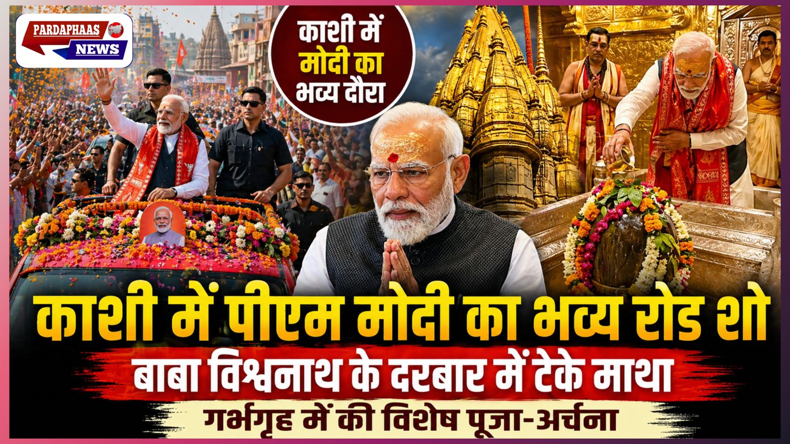 रोड शो के बाद प्रधानमंत्री मोदी सीधे श्री काशी विश्वनाथ मंदिर पहुंचे, जहां वैदिक परंपराओं के अनुसार पांच विद्वान पंडितों ने उनका विशेष पूजन कराया। प्रधानमंत्री ने गर्भगृह में करीब 20 मिनट तक बाबा विश्वनाथ का रुद्राभिषेक, पूजन और ध्यान किया। इस दौरान उन्हें माला पहनाई गई, माथे पर त्रिपुंड लगाया गया और वैदिक मंत्रों के बीच शिव आराधना संपन्न कराई गई।